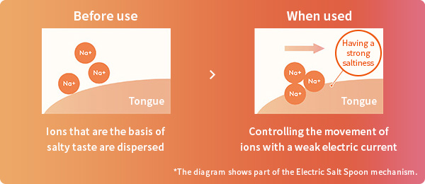 When the Electric Salt Spoon is used at mealtime, it controls the movement of ions by causing an electric current with a unique current waveform, which is drawn to the tongue where the taste is perceived. This mechanism allows for the enhancement of salty and umami tastes* of low-sodium foods.