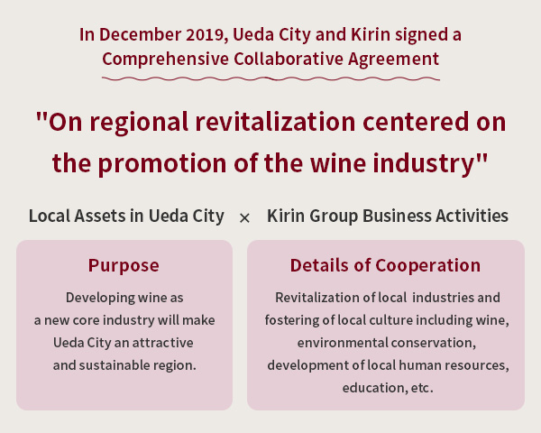 At the root of the community-based winery operation is the comprehensive collaboration agreement on "regional revitalization centered on wine industry promotion" signed in December 2019 between Ueda City, Nagano Prefecture, where the winery is located, and the Kirin Group.