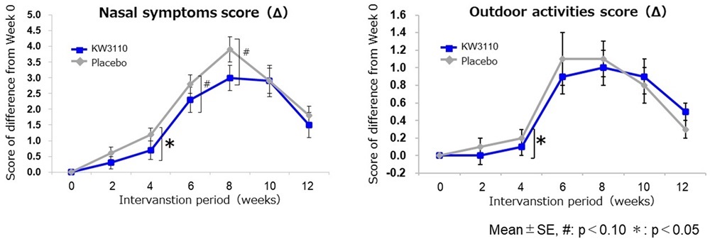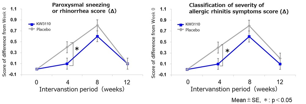 A clinical trial was conducted involving 120 men and women aged from 20 to 64 with mild to moderate allergic rhinitis to evaluate the effects of L. paracasei KW3110 on nasal and ocular symptoms as well as quality of life (QOL). During the spring pollen season (January to April), participants consumed either a food containing L. paracasei KW3110 (50 mg heat-killed bacteria, equivalent to over 140 billion cells) or a placebo food (without L. paracasei KW3110) for 12 weeks. The group that consumed the L. paracasei KW3110-containing food showed improved nasal symptom scores and reduced impairment in outdoor activities compared to the placebo food group, particularly during the initial pollen dispersal period observed at week 4 of consumption (Fig. 2).