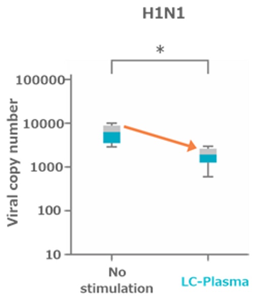 A concentration-dependent antiviral effect was observed when the culture supernatant from immune cells derived from healthy individuals, stimulated with LC-Plasma, was serially diluted and applied to cells infected with influenza virus (H1N1) and SARS-CoV-2.