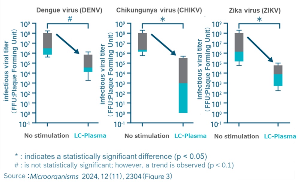 A paper published in Microorganisms (12(11):2304, 2024) titled The Antiviral Effects of Heat-Killed Lactococcus lactis Strain Plasma Against Dengue, Chikungunya, and Zika Viruses in Humans by Upregulating the IFN-α Signaling Pathway demonstrated that stimulation of immune cells by LC-Plasma was shown to have antiviral effects against dengue virus (DENV), chikungunya virus (CHIKV), and , which are known to cause mosquito-borne tropical infectious diseases.