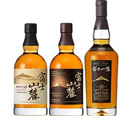 - ラインアップは樽出しのおいしさを気軽に味わうことができる「富士山麓 樽熟原酒50°」、今年4月に新発売した熟成のピークの原酒を厳選しブレンドした「富士山麓 シグニチャーブレンド」、稀少な長熟原酒をブレンドした「富士山麓 ブレンデッド18年 2016」など。