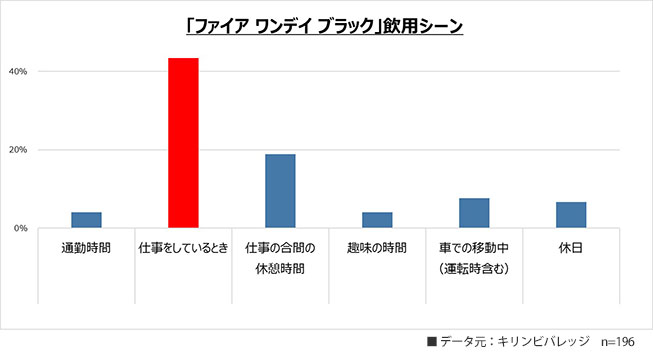 「ファイア ワンデイ ブラック」は2019年4月2日に発売し、冷たくても常温でもおいしい味わいと、パッケージデザインの良さ、600mlの大容量サイズが好評で、発売から11カ月で8,000万本を突破しました。リピート率は46%※と、過去2年間に発売されたブラックのペットボトルコーヒーにおける平均リピート率と比べて高く、40~50代の男性を中心に多くの支持を頂いています。なお、飲用シーンでは特にビジネスシーンのオンタイム(仕事をしているとき)に選択される傾向があります。