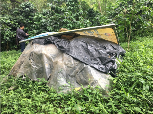ビニールで覆われ農園に放置されているコーヒーチェリー果肉果皮
