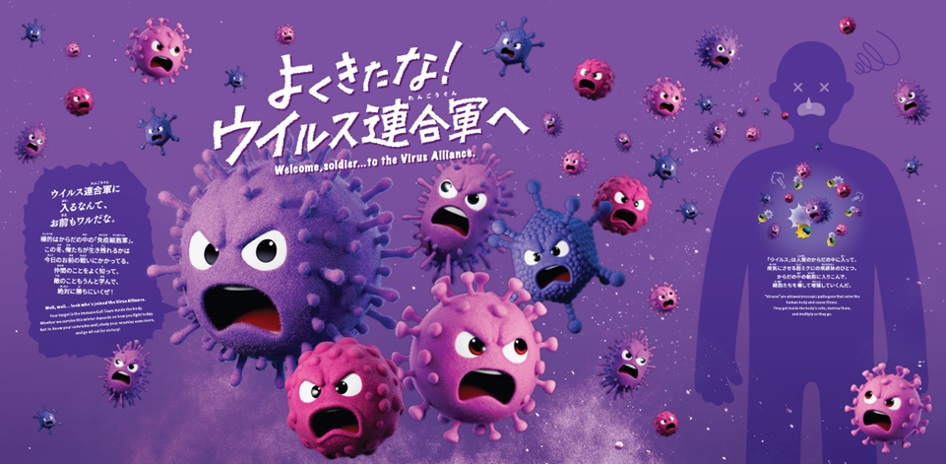 展示物や体験できるゲームを通じて、免疫の働きを体感しながら学べる内容となっており、からだの中で繰り広げられる“免疫”の戦いをテーマに、「免疫細胞軍」と「ウイルス連合軍」に分かれて展開されます。