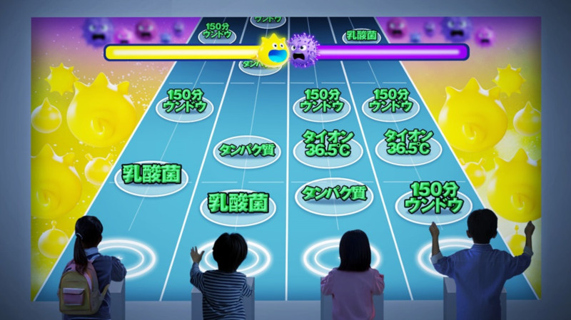 ・免疫細胞軍では、画面に免疫に必要な生活習慣や栄養素が表示された際、タイミングよくボタンを押すことで得点できます。