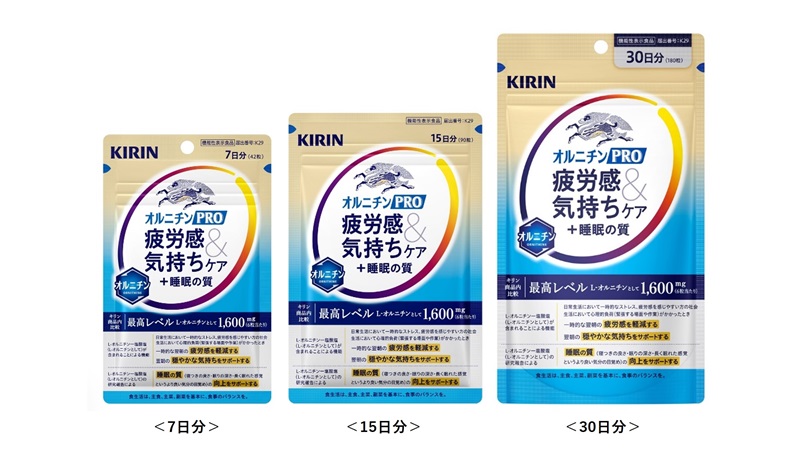 キリンホールディングス株式会社(社長 COO 南方健志、以下キリン)は、『疲労感』を軽減する機能と、『穏やかな気持ち』をサポートする機能※1をもち、さらに睡眠の質※2の向上をサポートする機能性表示食品の「キリン オルニチンPRO 疲労感&気持ちケア+睡眠の質 15日分」を12月2日(火)に通販で新発売、同商品の7日分、30日分を2026年3月17日(火)に全国のドラッグストアにて発売します。