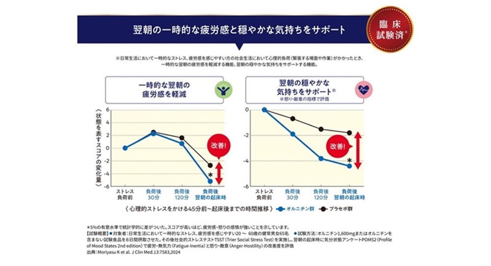 結果、オルニチン群はプラセボ群と比較してTSST翌朝の疲労-無気力尺度および怒り-敵意尺度を有意に改善しました。以上から、オルニチンPROの摂取によって、一時的な翌朝の疲労感を軽減する機能、翌朝の穏やかな気持ちをサポートする機能があることが確認されました。