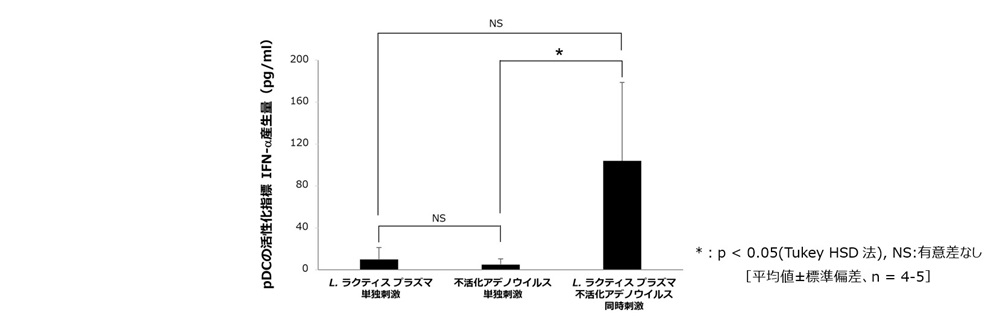 「L.ラクティス プラズマ」のpDCに対する同時刺激が、アデノウイルスに対する抗ウイルス性物質の産生量を有意に上昇させることが確認され、「L.ラクティス プラズマ」の同時刺激により、アデノウイルスに対する抗ウイルス応答が速やかに誘導されることが示唆されました。