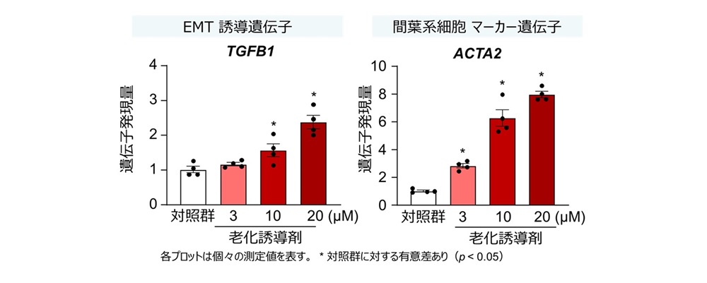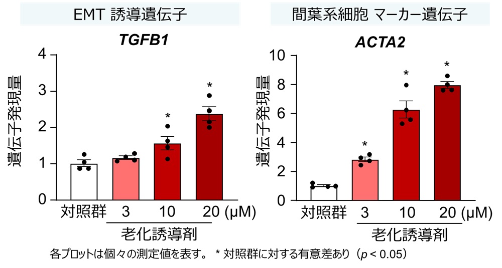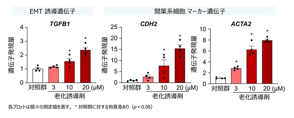 ② EMTを誘導する遺伝子や、間葉系細胞のマーカー遺伝子の発現量が増加することが確認され、細胞老化によるEMTの誘導が示唆されました(図2)。