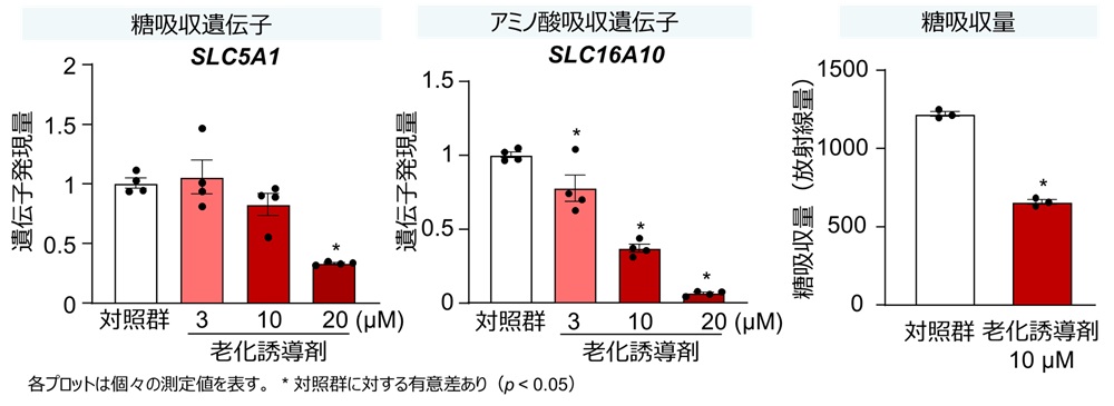 正常なヒト小腸オルガノイドと、細胞老化モデルヒト小腸オルガノイドにおいて、栄養素吸収に関わる遺伝子発現量を比較しました。細胞老化の誘導により、糖の吸収に関わる遺伝子であるSLC5A1、アミノ酸の吸収に関わる遺伝子であるSLC16A10の発現量が減少していることが明らかになりました。さらに、細胞老化モデルにおいて、細胞内への糖吸収量が減少していることが明らかになりました(図1)。