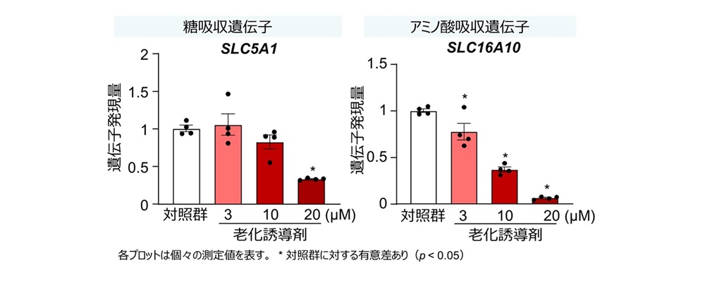 ① ヒト小腸オルガノイドの細胞老化を誘導したところ、糖やアミノ酸の取り込みに関与する遺伝子発現量の減少が確認され、細胞老化による栄養素吸収低下が示唆されました(図1)。