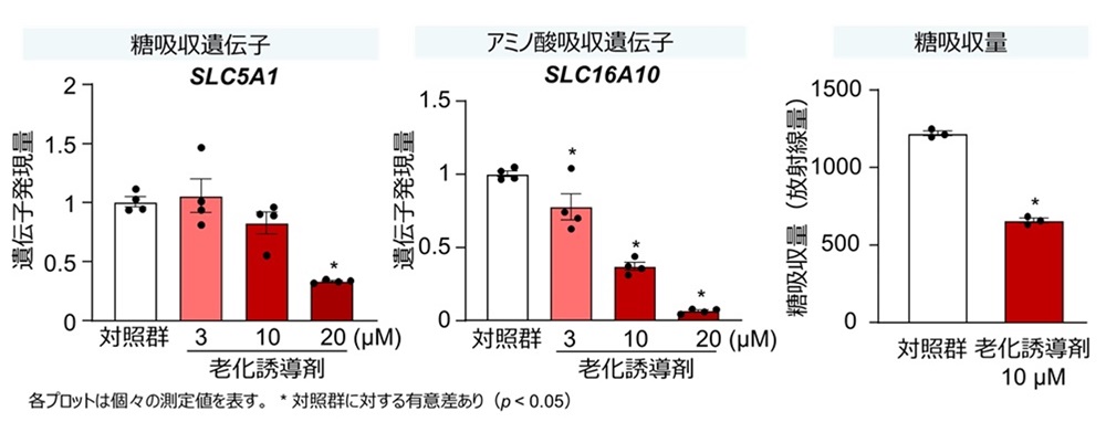 図1.細胞老化モデルヒト小腸オルガノイドにおける栄養素吸収関連遺伝子発現および糖吸収量の減少