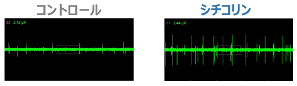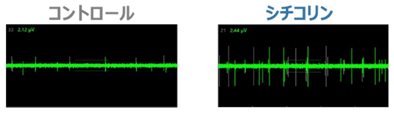 シチコリンの経口摂取により腸-神経のコリン作動性シグナルの活性が増加すること(図1)、さらに、そのシグナルの受容体への応答が最大となる時点において、腸管求心性神経のシナプス(神経細胞同士が情報をやり取りする接合部)内のアセチルコリン(神経伝達物質)量が用量依存的に増加すること(図2)がシミュレーションにより見出されました。更に、本結果をうけて、腸-神経の共培養細胞モデルを用いて神経シグナル活性を微小電極アレイで評価したところ、シチコリンが腸を介して神経活動を活性化する作用を見出しました(図3、図4)。