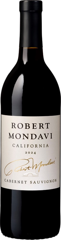 ロバート・モンダヴィのサインと、ワイナリー象徴の「アーチ&タワー」エンボスを配し、クラフトマンシップとラグジュアリー感を表現しています。洗練されたオフホワイトのラベルが特長です。