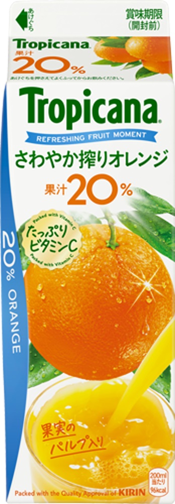 「トロピカーナ さわやか搾りオレンジ」は、そうしたニーズに応えるため、果実のおいしさにこだわりながら、すっきりとゴクゴク飲める味わいを目指して開発しました。甘味と酸味のバランスが良いオレンジ果汁に、パルプ(オレンジの繊維分)を使用することで、果汁20%でありながら、満足感のある果実感を実現しています。
