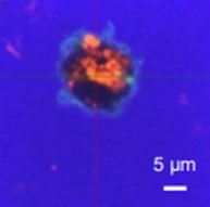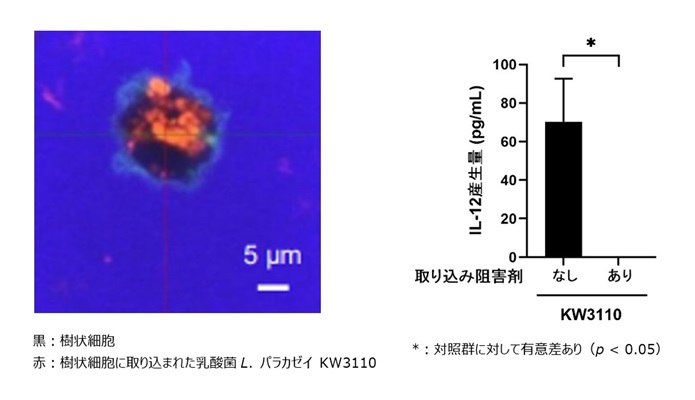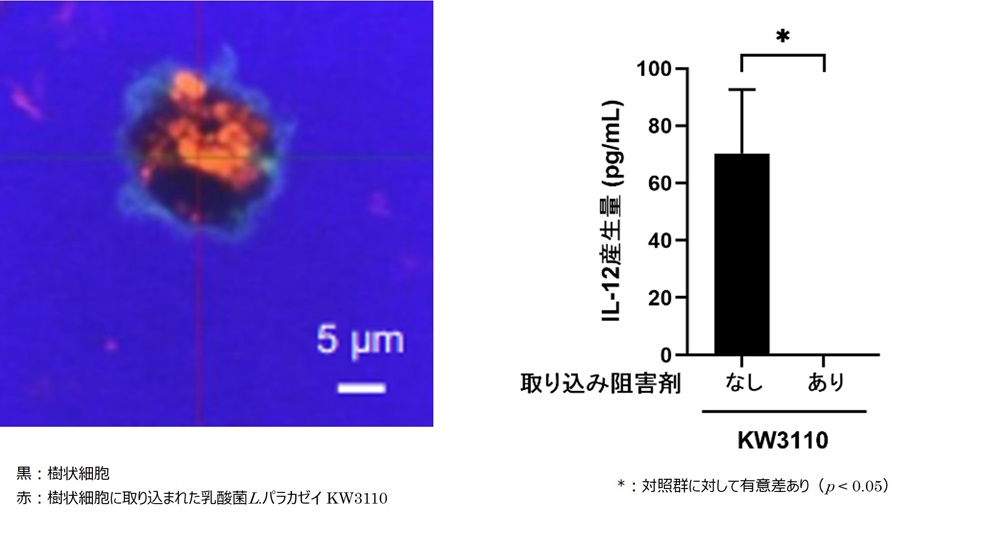 共焦点顕微鏡により、樹状細胞内に乳酸菌L. パラカゼイ KW3110が取り込まれていることを確認しました。また、この取り込みを阻害すると、IL-12産生が誘導されなくなったことから、樹状細胞に乳酸菌L. パラカゼイ KW3110が認識され、取り込まれることがIL-12産生誘導に重要であることを確認しました。