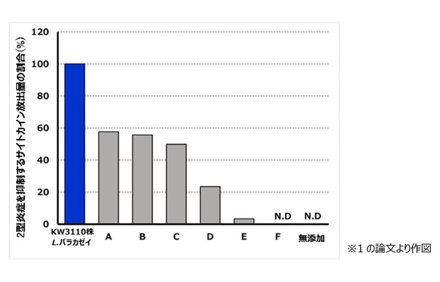 図1.各種乳酸菌によって刺激された免疫細胞の2型炎症を抑制するサイトカイン(IL-12)産生量の割合