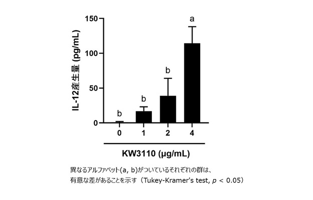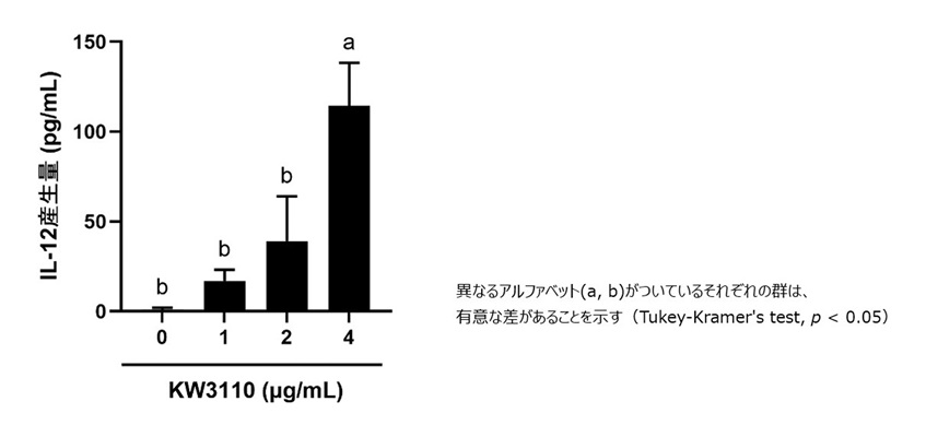 乳酸菌L. パラカゼイ KW3110は樹状細胞に作用し、IL-12産生を濃度依存的に誘導することを確認しました(図1)。
