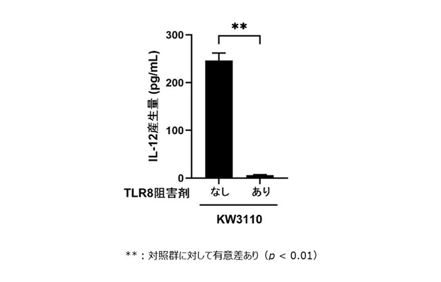 樹状細胞において、乳酸菌L. パラカゼイ KW3110由来のRNAはIL-12産生を誘導することを確認しました(図3左図)。一方で、1本鎖RNAを認識するTLR8を選択的に阻害すると、乳酸菌L. パラカゼイ KW3110によるIL-12産生誘導がみられなくなったことから、RNAが樹状細胞内のTLR8を介して認識されることで、IL‑12の産生が促進されることを確認しました(図3右図)。