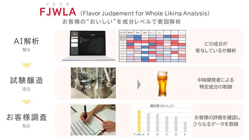 「FJWLA」は、「お客様調査データ×成分分析データ×AI」を統合し、お客様の“なぜおいしいのか”を要因分解してビールづくりに直結させる技術です。「FJWLA」によりお客様調査における香味の改善点を成分レベルで特定し、これまで培ってきた醸造家のビールづくりの知見を組み合わせることで、理想とする香味を高精度かつ効率的に実現します。